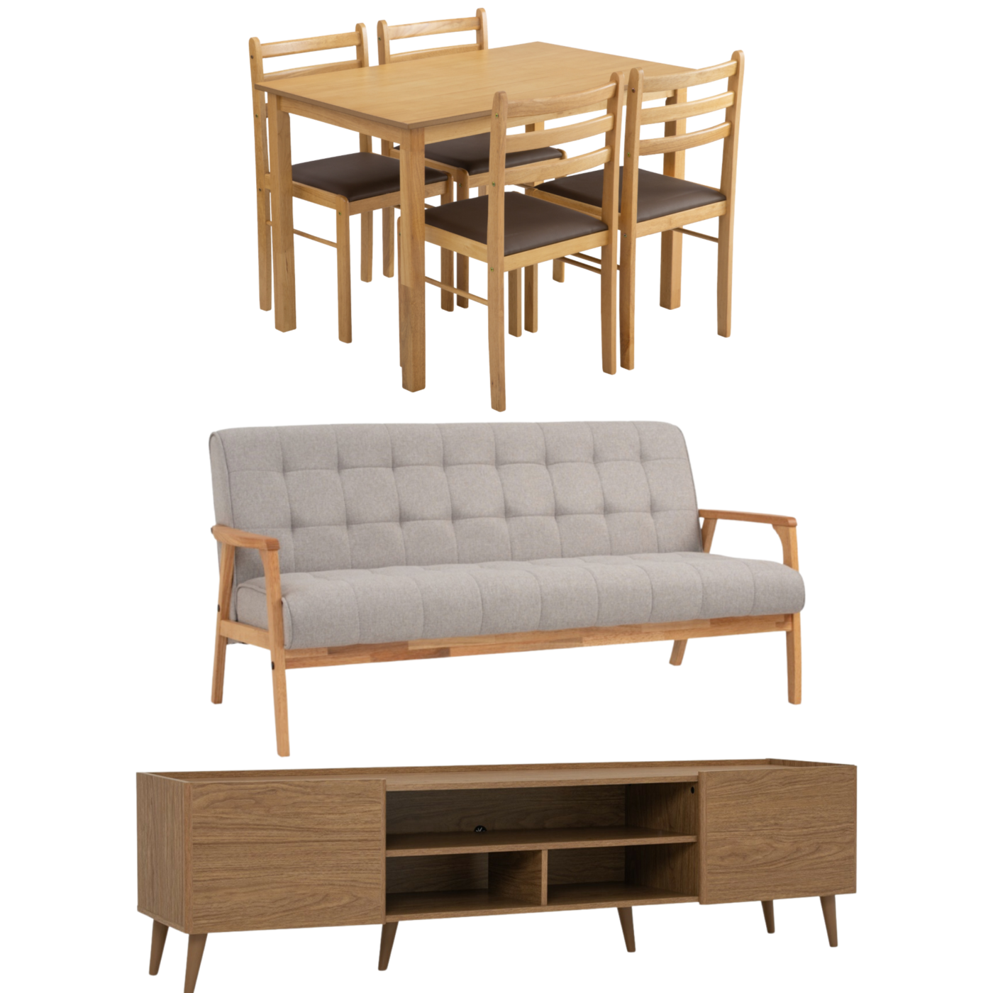 主要材料 | 椅子長凳:橡膠木飾面+馬來西亞橡木+仿皮 電視櫃 : 塑膠+木板, 梳化 : 實木+木紋層壓板+棉 |