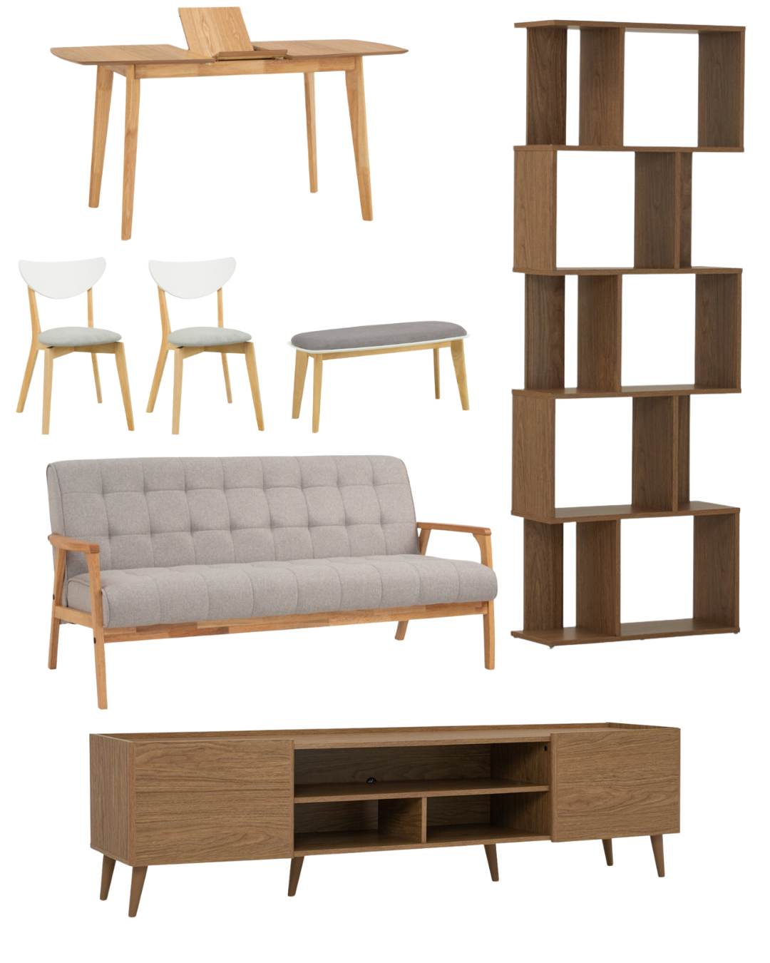 主要材料 | 椅子長凳:馬來西亞橡木 電視櫃 : 塑膠+木板, 梳化 : 實木+木紋層壓板+棉 |