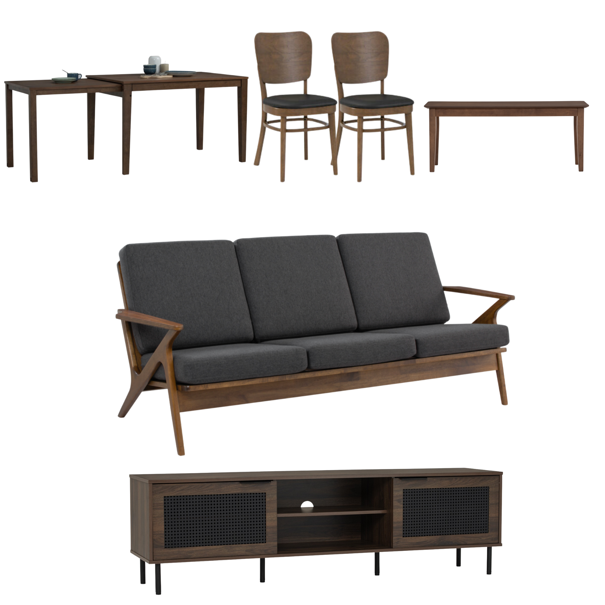 | 尺寸(闊x深x高) | 餐桌:120(+75) x 75 x 75cm 餐椅:41.5 x 50.5 x 83.5cm 座高45.5cm 長凳:W1100 D350 H450 mm 梳化:W1785 D780 H770 SH380 mm 電視櫃:180 x 40 x 52cm |