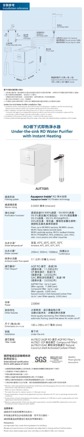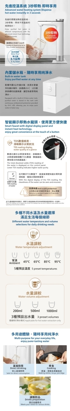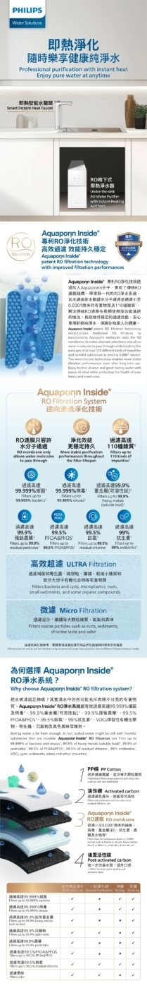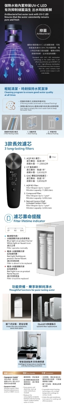 過濾小至0.0001微米的雜質及水中 110種有害物質 / 創新 Aquaporin Inside®專利RO淨化技術可穩定淨化效能 / 過濾包括99.999%病毒、99.999%細菌、 99.99% 殘餘農藥 / 過濾包括99%抗生素、99.9%重金屬(可溶性鉛)、和更多有害物質 / 過濾包括99.8% PFOA & PFOS* / 智能顯示即熱水龍頭; 顯示水溫、水質(TDS值)、水量及濾芯夀命 / 內置 8 公升水箱,配有 UV-C LED 抗菌保護 / 5種水溫及4種暖熱水量選擇 / 非觸式停水感應 / AQP RO濾芯 - 長達3年 (過濾水量: 10,950公升) / 複合濾芯 - 長達1年 (過濾水量: 3,650公升) / 天然椰殼活性碳濾芯 - 長達1年 (過濾水量: 3,650公升)